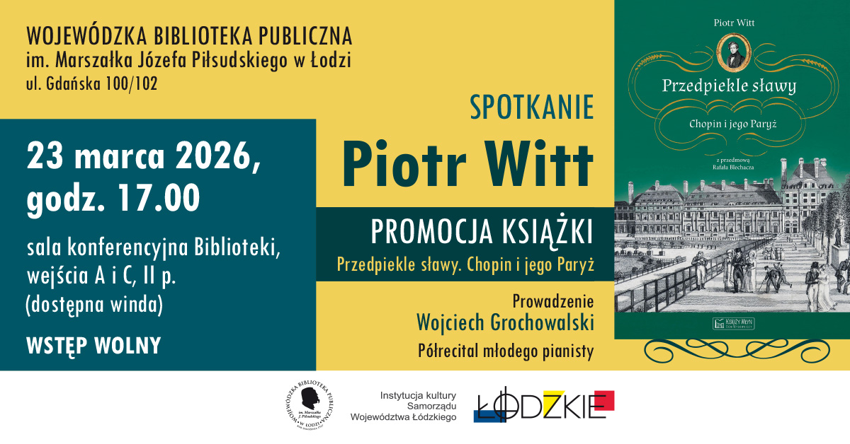 Skontaktuj się z namiWojewódzka Biblioteka Publiczna im. Marszałka Józefa Piłsudskiego w Łodzi zaprasza na spotkanie z Piotrem Wittem – historykiem, eseistą i publicystą, autorem książki „Przedpiekle sławy. Chopin i jego Paryż”. Prowadzenie: Wojciech Grochowalski.
