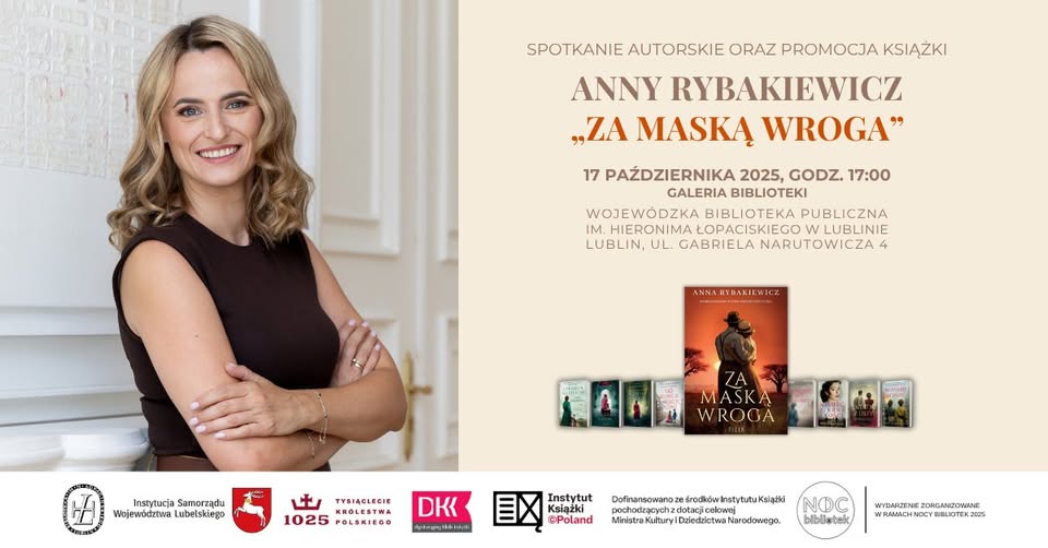 oraz Dyskusyjny Klub Książki serdecznie zapraszają na spotkanie autorskie z Anną Rybakiewicz poświęcone promocji najnowszej powieści autorki pt. „Za maską wroga”
