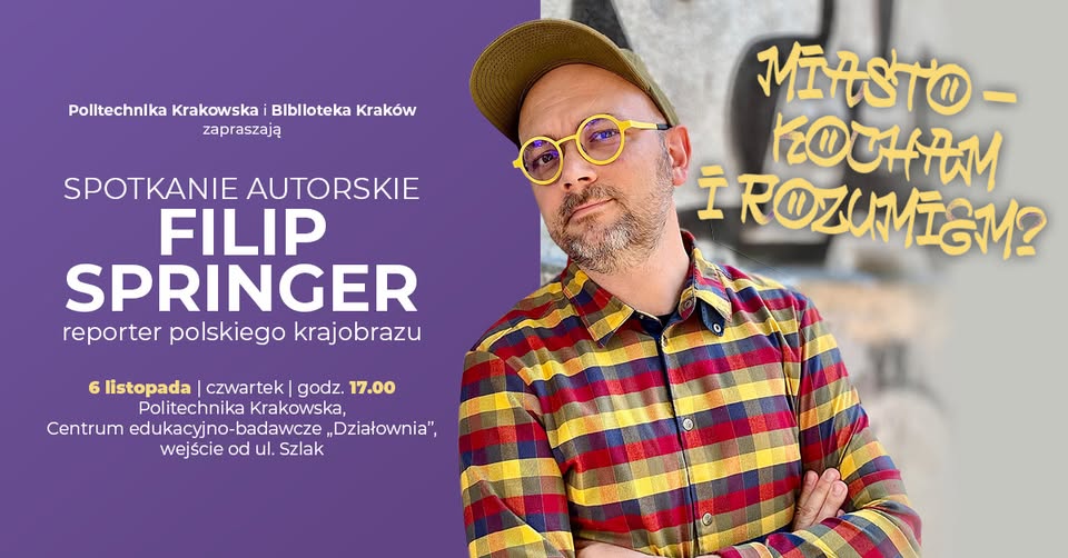Biblioteka Kraków i Politechnika Krakowska mają zaszczyt zaprosić na wyjątkowe spotkanie w ramach cyklu "Biblioteka w miejscach nieoczywistych", które poświęcone będzie refleksji nad przestrzenią miejską i polskim krajobrazem. Gościem specjalnym wieczoru będzie FILIP SPRINGER - jeden z najwybitniejszych współczesnych reportażystów, którego książki na trwałe zmieniły sposób postrzegania architektury i przestrzeni w Polsce.