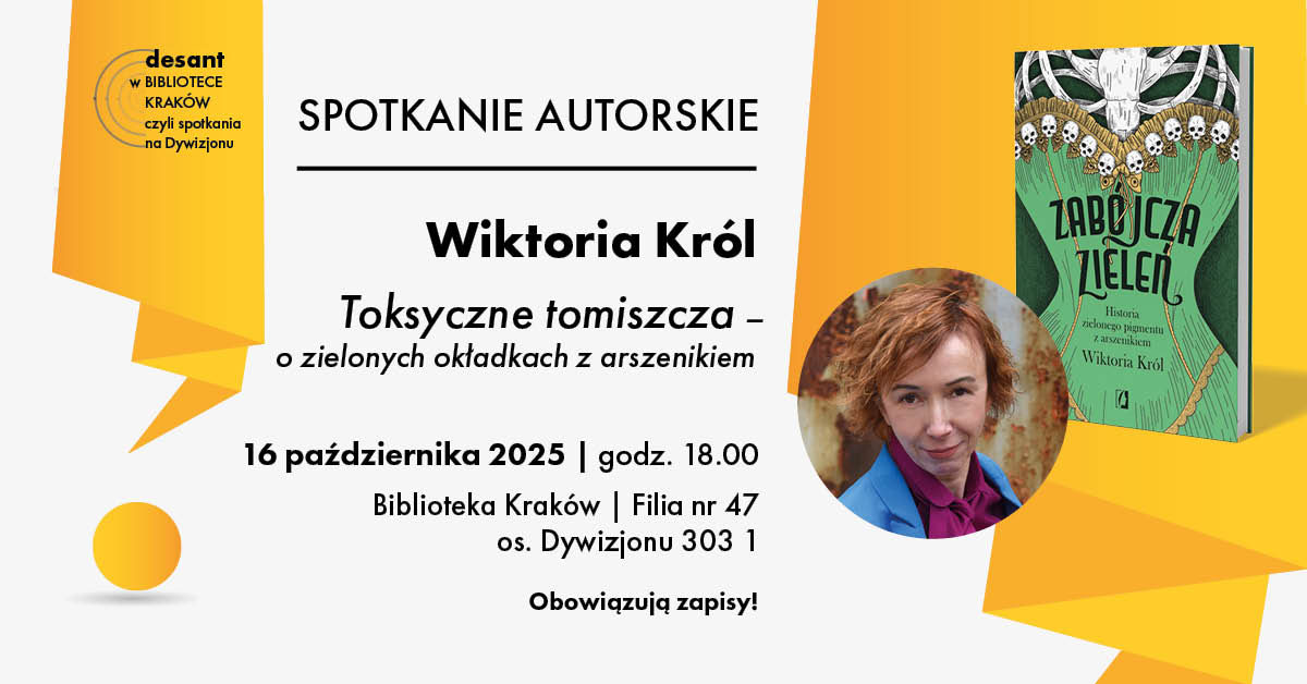 Podczas wieczoru porozmawiamy o jej książce „Zabójcza zieleń. Historia zielonego pigmentu z arszenikiem” – fascynującej opowieści o szmaragdowym odcieniu, który zachwycał i... zabijał.